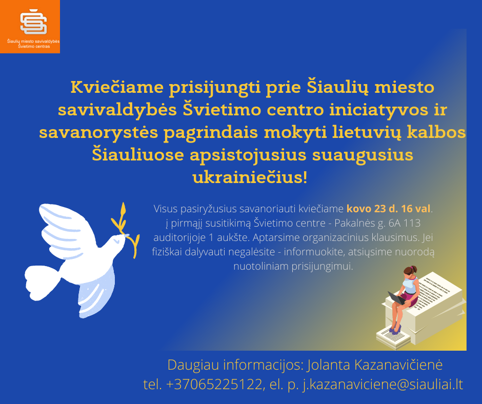 Šiaulių miesto savivaldybės švietimo centras kviečia į lietuvių kalbos kursus (pradedančiojo vartotojo lygmuo A1). Kursai nemokami, juos ves pedagogai savanoriai. Kursų trukmė – 13 savaičių, vyks du užsiėmimai po 2 val. per savaitę pradedant kovo 28 d. Grupės dydis 8-10 dalyvių, gali būti renkamos kelios grupės. Informacija tel. +370 65225122 arba +370 68076955, registracija į kursus Švietimo centro tinklapyje www.sv.centras.lt.