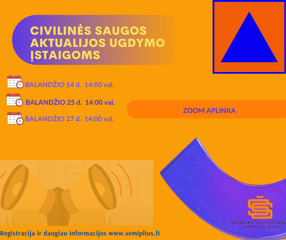 2022 m. balandžio 14 d. , balandžio 25 d. ir balandžio 27 d. 14.00 val. įstaigų vadovus, žmogaus saugos ir kitų dalykų mokytojus bei klasės auklėtojus kviečiame dalyvauti nuotoliniame seminare (ZOOM aplinka) „Civilinės saugos aktualijos ugdymo įstaigoms“(ilgalaikė programa „Kaip elgtis krizinėse situacijose“).