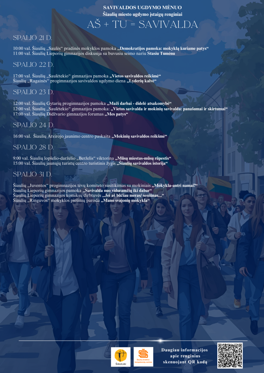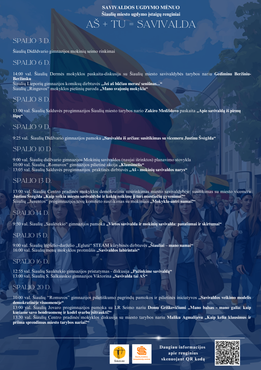 Šiauliuose spalio mėnuo oficialiai paskelbtas Savivaldos mėnesiu – puikia proga švęsti vietos bendruomenės galią ir aktyviai įsitraukti į miesto gyvenimą. Šia proga miesto mokyklos entuziastingai jungiasi prie šios iniciatyvos, organizuodamos visą mėnesį trunkančią renginių virtinę, skirtą žinių plėtrai ir pilietiškumo ugdymui. Tai mokyklų organizuojami renginiai savoms bendruomenėms!