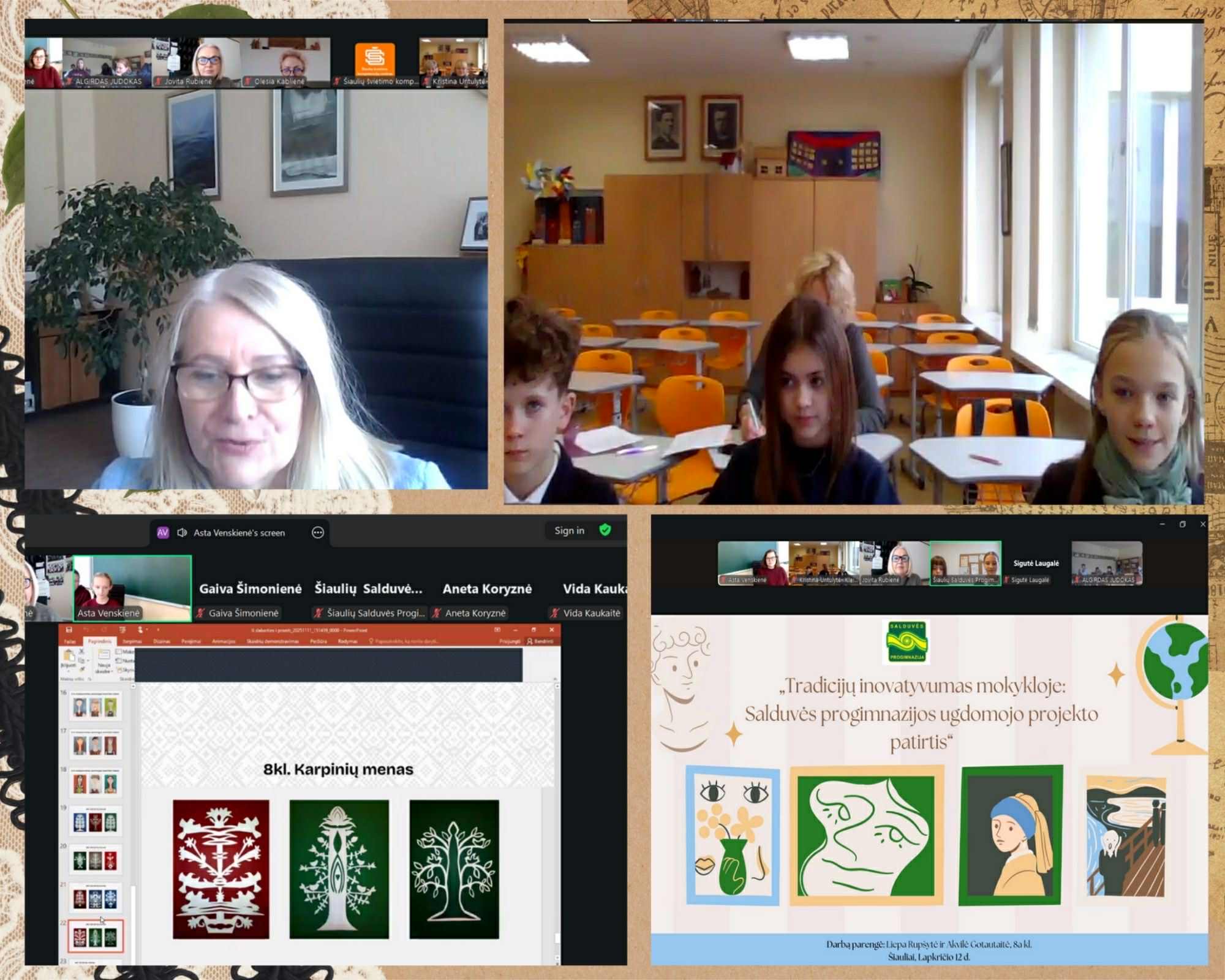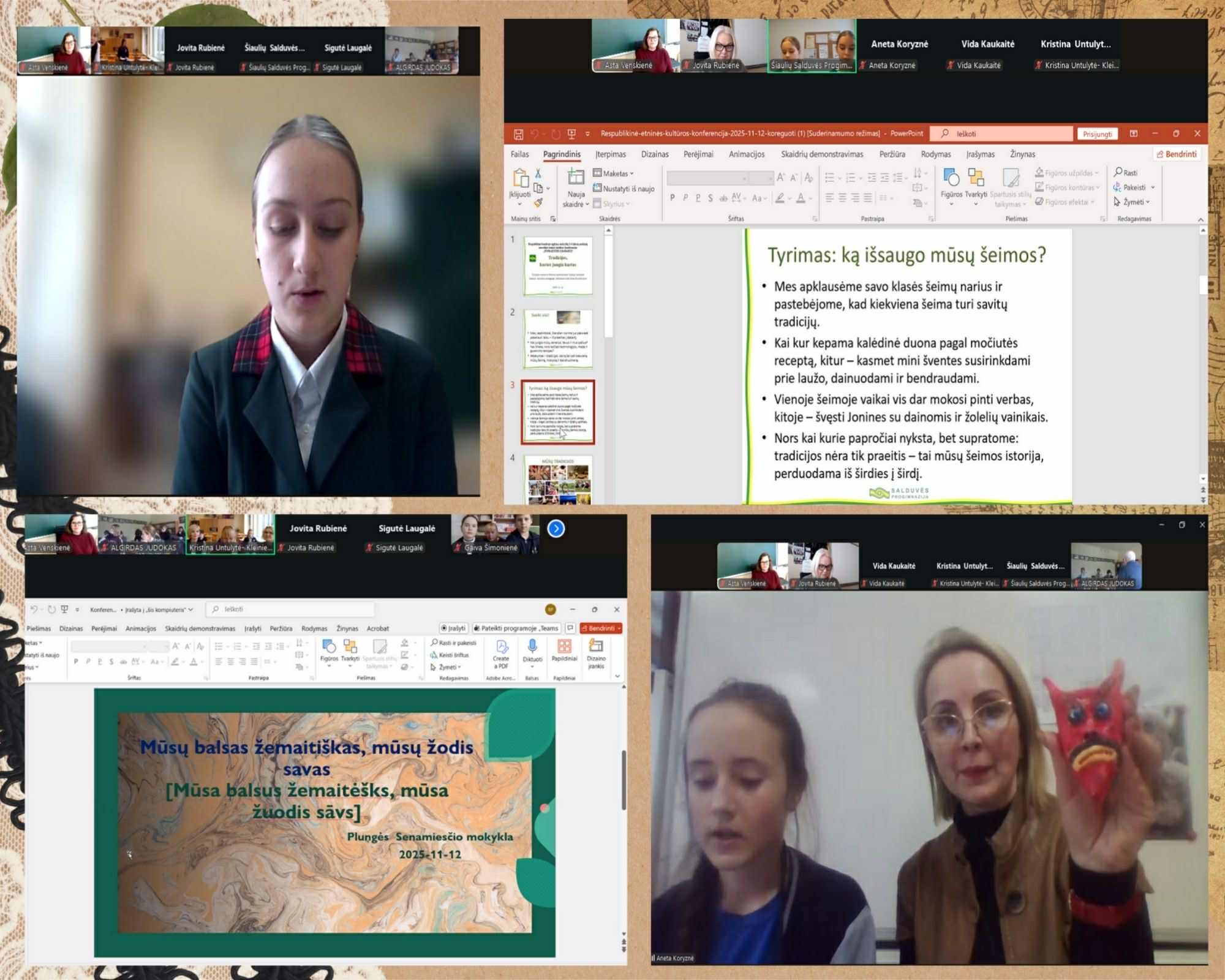 Ypatingą įspūdį paliko Viltės Božytės ir Giedrės Gutauskaitės iš „Romuvos“ progimnazijos kūrybinis žvilgsnis į tradiciją pranešime „Verpstė – šiandienos kontekste“, kuriame jos parodė, kaip senasis moters buities simbolis gali atgyti šiuolaikinėje meninėje interpretacijoje. O Elzė ir Urtė Paulauskaitės iš Šiaulių Ragainės progimnazijos pristatė originalų projektą „Audimas ant rėmelio. EKO kilimas“, įrodydamos, kad ekologija ir senosios audimo technikos gali darniai susilieti.