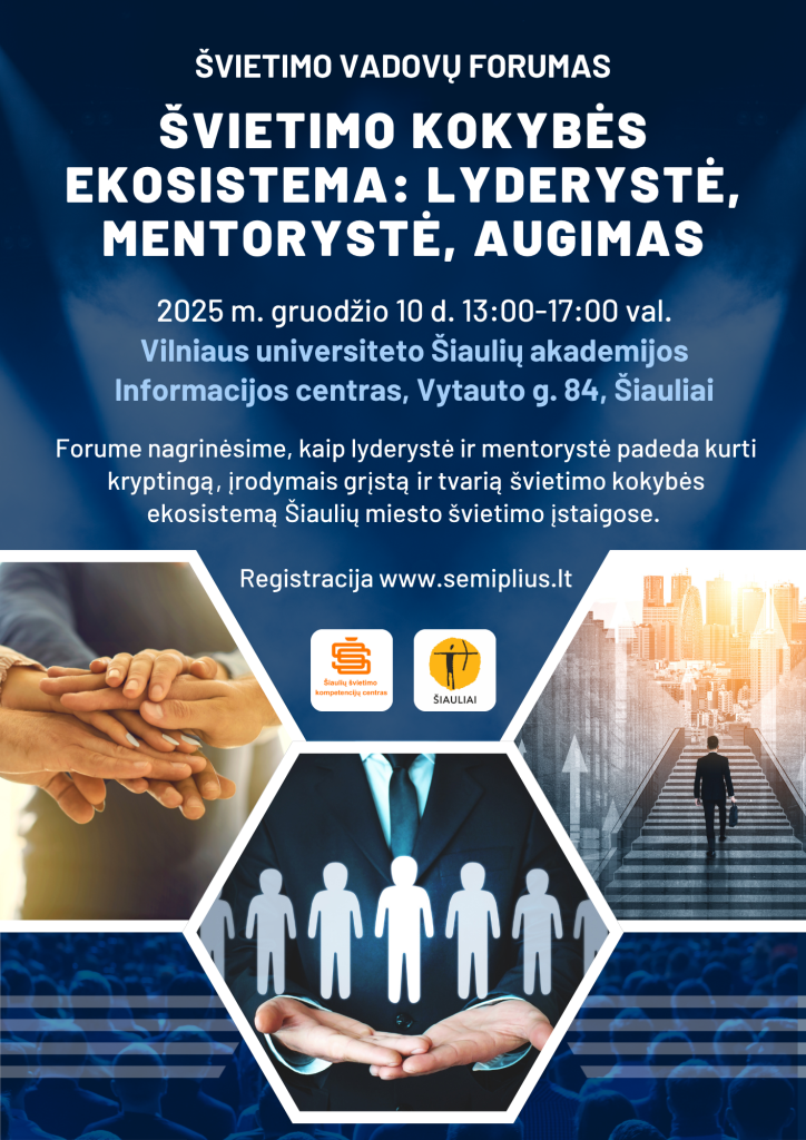 2025 m. gruodžio 10 d. 13.00 val. dar kartą kviečiame visus ugdymo įstaigų vadovus dalyvauti forume „Švietimo kokybės ekosistema: lyderystė, mentorystė, augimas“.