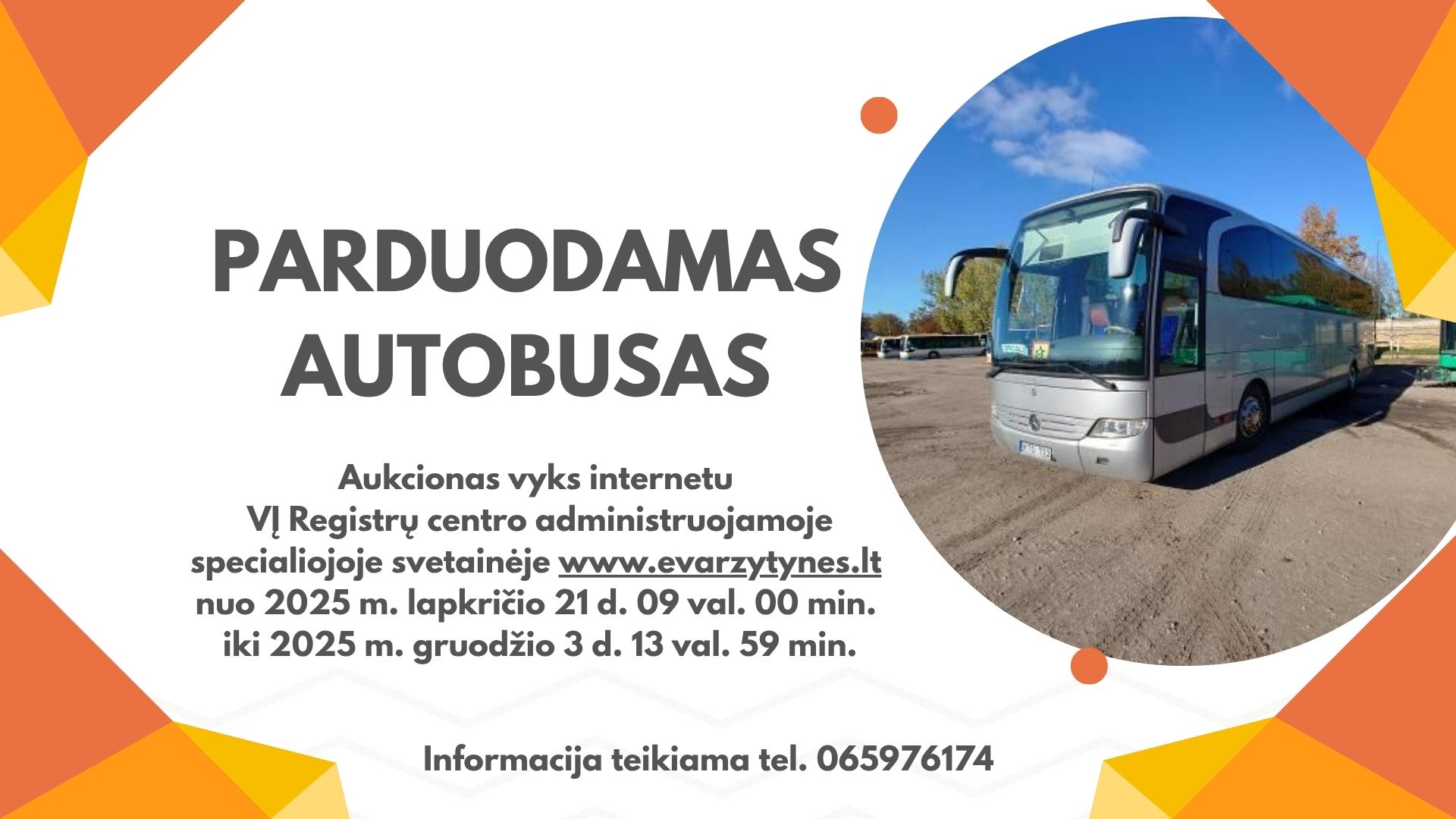 Aukciono organizatorius: Šiaulių švietimo kompetencijų centras, įstaigos kodas 300056938, adresas Pakalnės 6A, Šiauliai. Aukciono vykdymo būdas: elektroninis aukcionas, vykdomas aukciono dalyviams internetu registruojantis VĮ Registrų centro administruojamoje specialiojoje svetainėje  www.evarzytynes.lt. Informacija apie parduodamą turtą:duomenys - autobusas MERCEDES