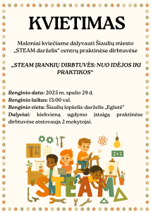 Kviečiame Šiaulių miesto „STEAM darželis“ centrų mokytojus iš Šiaulių lopšelių-darželių „Pupų pėdas“, „Ežerėlis“, „Voveraitė“, „Berželis“, „Žirniukas“, „Drugelis“, „Pasaka“ „Eglutė“, Rėkyvos progimnazijos ikimokyklinio skyriaus dalyvauti praktinėse dirbtuvėse „STEAM ĮRANKIŲ DIRBTUVĖS: NUO IDĖJOS IKI PRAKTIKOS“.